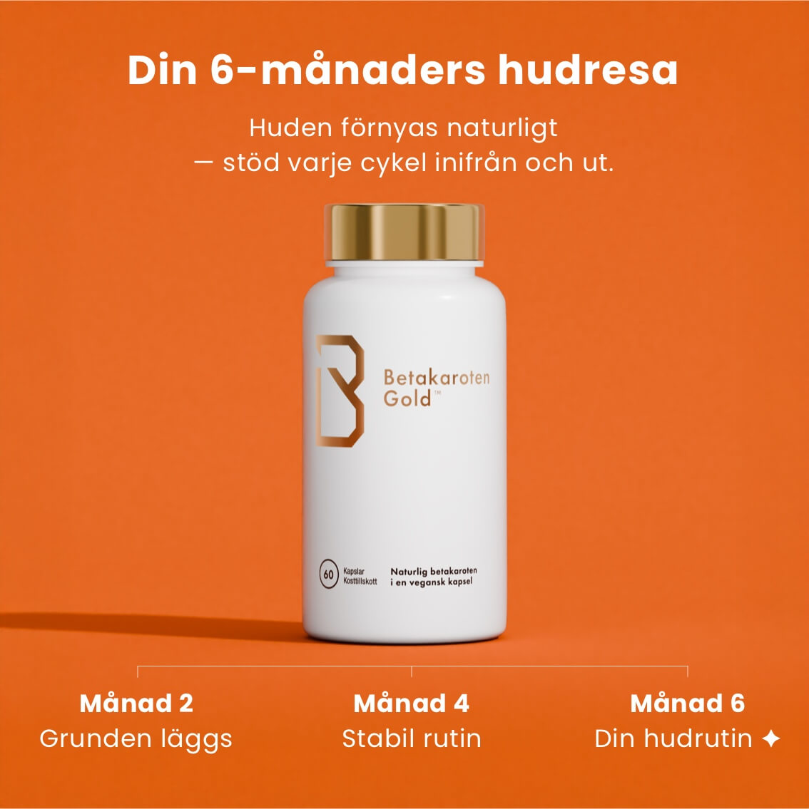 Betakaroten är en kraftfull antioxidant som omvandlas till vitamin A – ett fettlösligt vitamin som är viktigt för att bibehålla en hälsosam hud. Betakaroten Gold innehåller även koppar, biotin samt vitaminerna C och E, som kan stödja hudens hälsa och kollagenproduktionen.